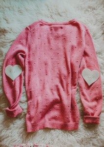 6. Thread your needle and sew your heart elbow patches onto sweater sleeves. I used a running stitch (over-under) because it’s a very simple, easy stitch, and I liked the contrasting of the red thread and white heart against the pink sweater. **If you are opting to use fabric glue instead of sewing, then glue your hearts on, and let it dry.